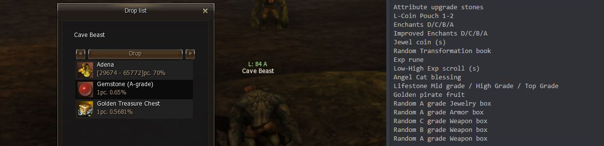 Guarida de Antharas. Ahora hay monstruos de alto nivel (84 y superiores) en la Guarida de Antharas. Todos los monstruos en esta ubicación tienen probabilidad de soltar un Cofre Dorado del Tesoro. Los objetos posibles que se pueden obtener del Cofre Dorado del Tesoro se muestran en la imagen siguiente.